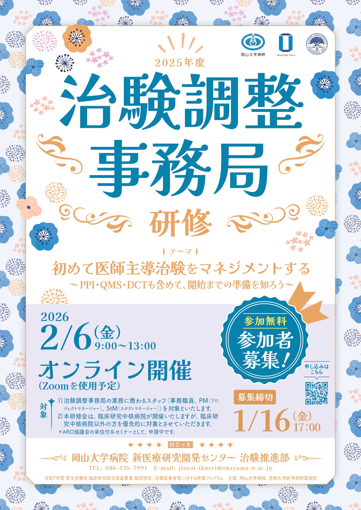 | 対象 | 臨床研究支援者(医局秘書、事務職員、看護師等) 臨床研究にかかわる方はどなたでも参加可能です。 |